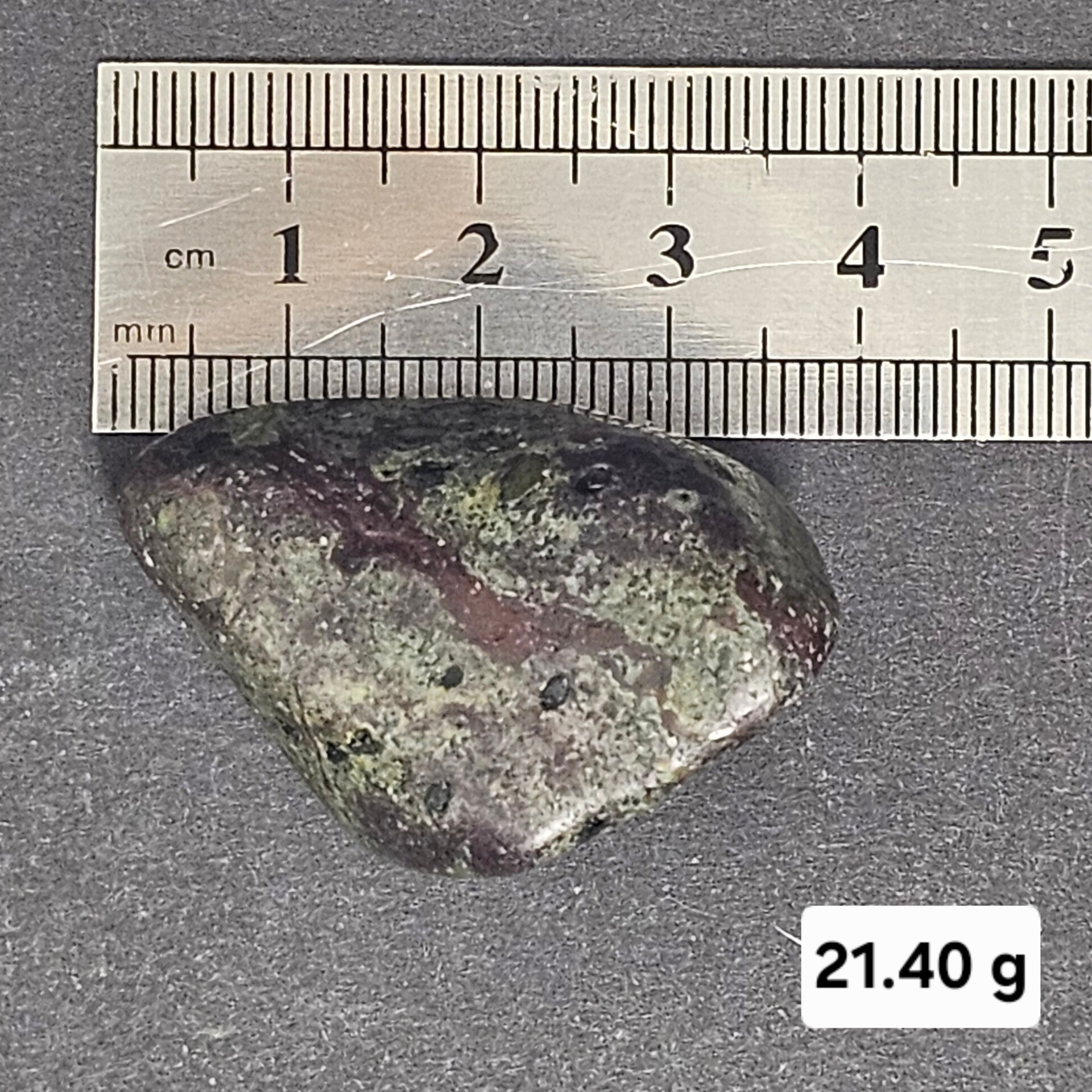 Couleur : Veinage rouge (dû à l'Hématite) sur fond verdâtre (dû à la Calcédoine ou à l'Épidote/Fuchsite).