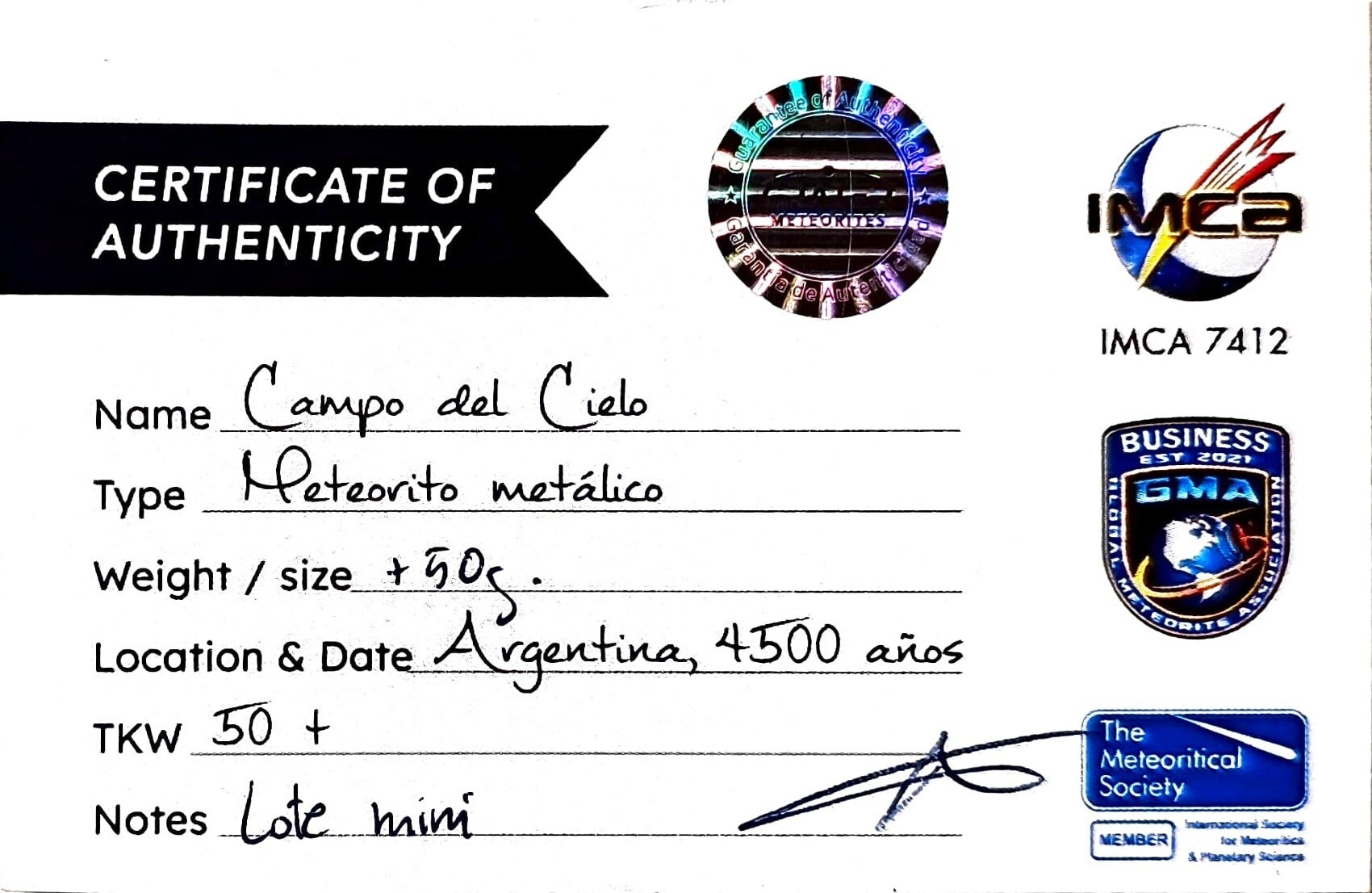 La Météorite Campo del Cielo, dont le nom signifie "Champ du Ciel", est un fragment extraterrestre riche en fer et en nickel, tombé sur Terre il y a des milliers d'années en Argentine. Véritable passerelle entre le cosmos et notre planète, elle symbolise la force primordiale, la détermination et l'élévation spirituelle. C'est une pierre d'ancrage puissant qui connecte l'être à l'énergie de l'Univers, favorisant la transformation et la concrétisation des idées.