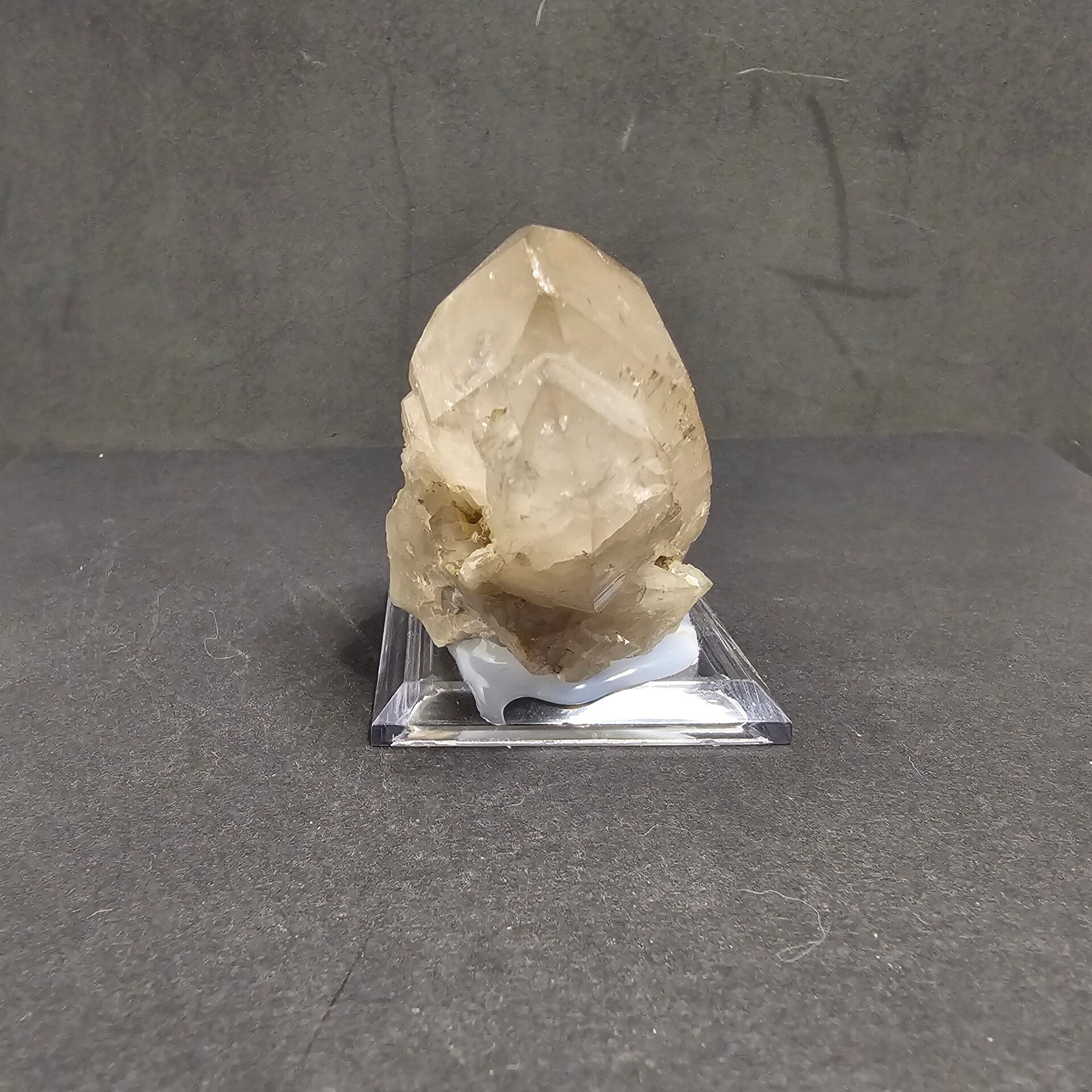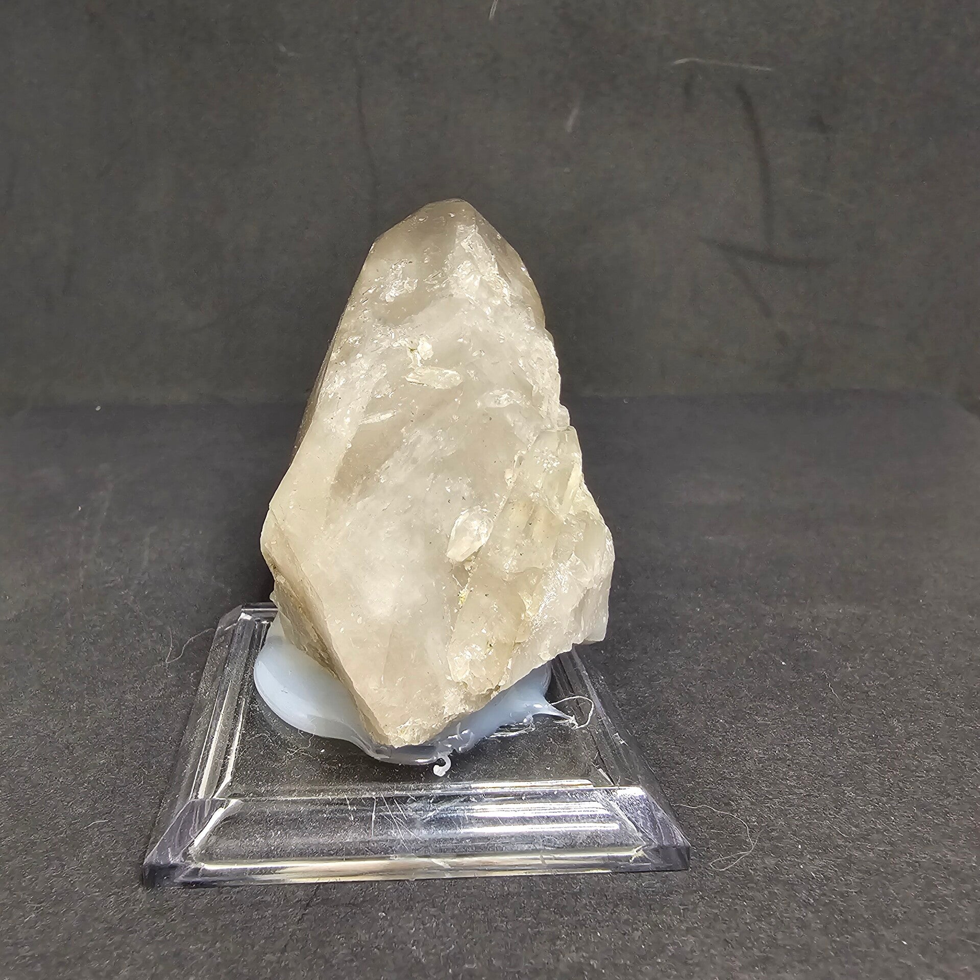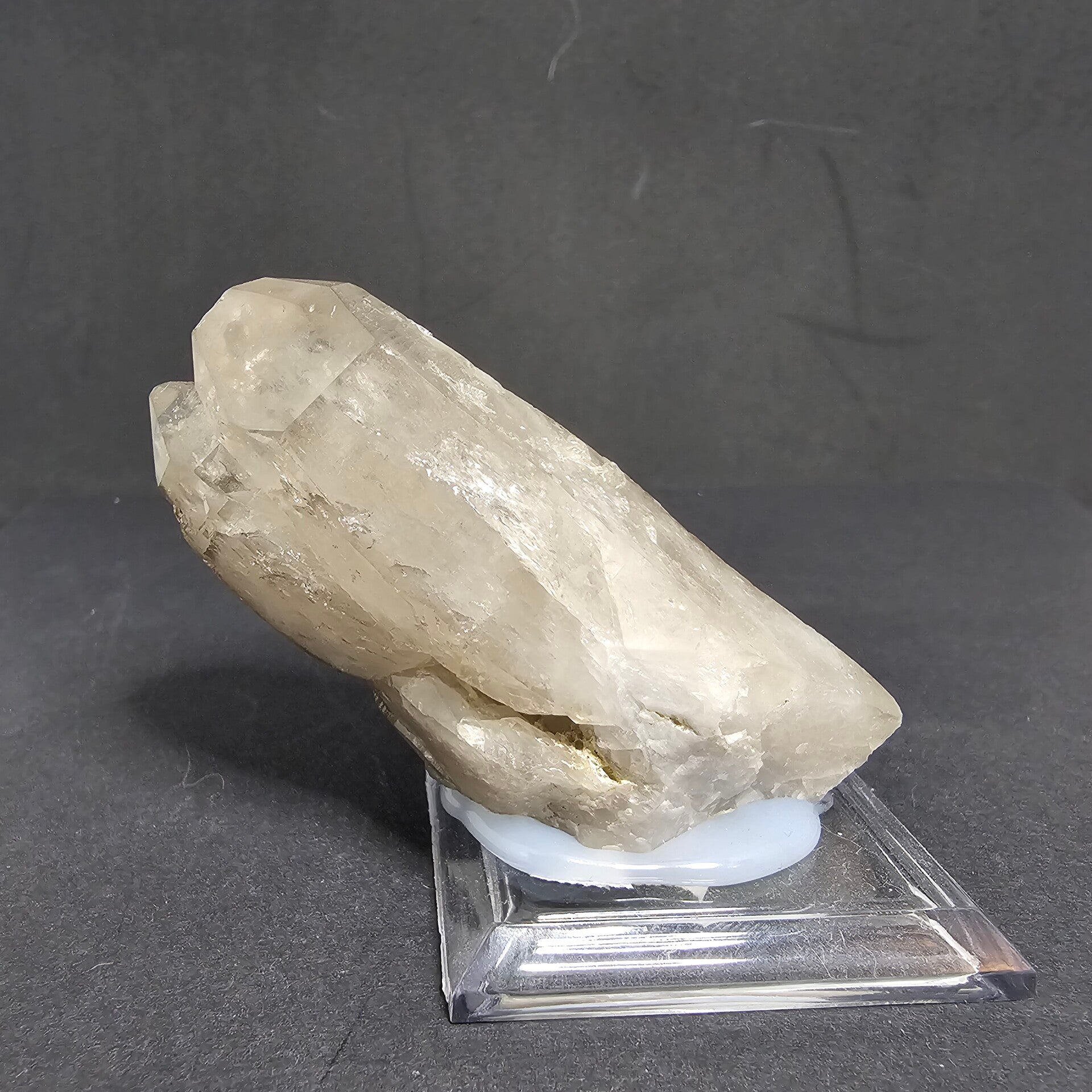 Ce cristal se distingue par sa couleur très claire, tirant vers un Quartz Fumé léger, avec des zones plus laiteuses qui lui confèrent une grande luminosité. Sa forme est complexe et attrayante : il semble être un agrégat de cristaux ou un cristal biterminé (deux terminaisons visibles) orienté horizontalement.