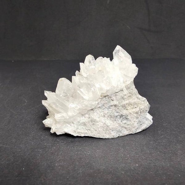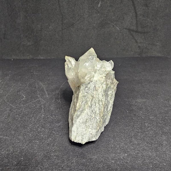 Ce qui rend cette pièce remarquable est le contraste saisissant entre les cristaux et leur roche mère. Les pointes de quartz sont majoritairement transparentes à translucides, bien formées et pointent dans diverses directions, créant un effet de couronne scintillante. Elles sont solidement implantées sur une matrice rocheuse distincte, d'une couleur gris pâle et texturée (un gneiss ou un schiste local). Cette matrice souligne la pureté des cristaux qui en émergent.