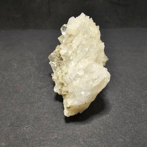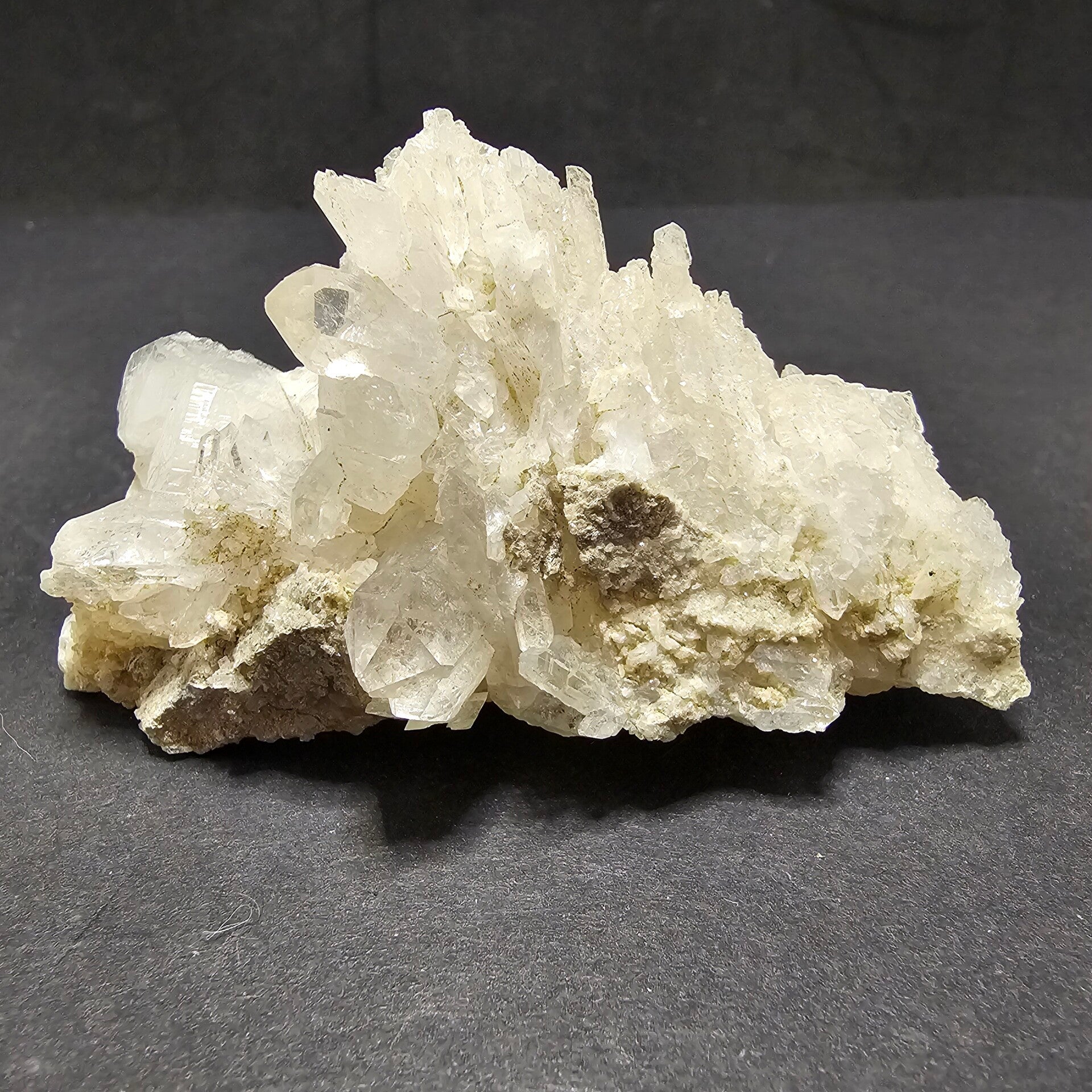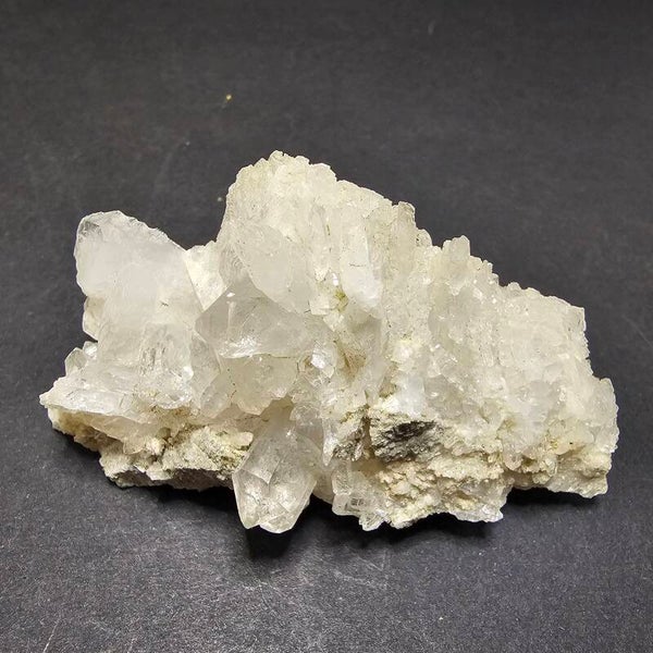 Ce cristal se distingue par sa formation en agglomérat dense de pointes, souvent appelées "druse" ou "grappe de cathédrale" lorsqu'elles sont aussi serrées. Les cristaux, de couleur blanc laiteux à très translucide, présentent des formes bien définies, certaines plus massives, d'autres plus fines et piquantes. Ils sont incrustés sur une matrice rocheuse pâle et rugueuse, qui peut présenter des teintes de gris ou de vert très clair, typique des roches alpines métamorphiques. La base rugueuse contraste magnifiquement avec la pureté des pointes cristallines, faisant de ce spécimen une véritable pièce de collection alpine.