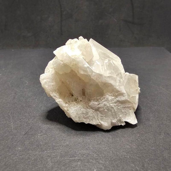 Ce qui distingue cette pièce est la taille massive et la clarté de ses principaux cristaux. Plutôt qu'une grappe de fines pointes, ce spécimen présente un ou plusieurs cristaux majeurs aux formes prismatiques bien visibles et aux faces larges et lisses. Le quartz varie de translucide à légèrement laiteux, avec une brillance vitreuse prononcée sur les faces bien formées. Il est supporté par une petite quantité de matrice rocheuse blanche ou grisâtre, discrètement visible à la base, garantissant son origine naturelle de fissure alpine. C'est un spécimen qui démontre la force et la grandeur des formations cristallines alpines.