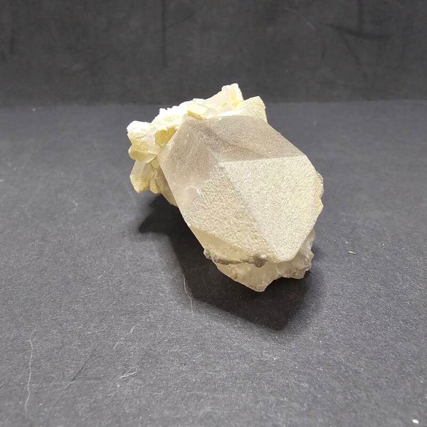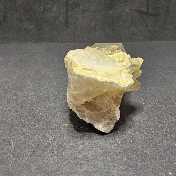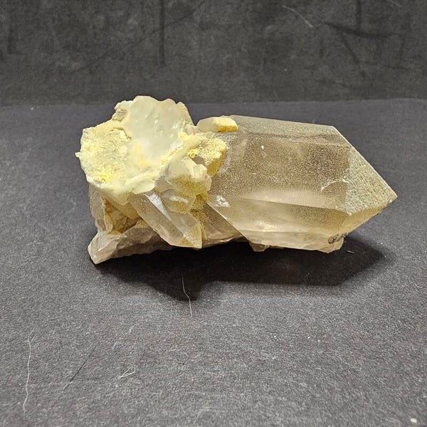 Cette pièce se distingue par la couleur particulière de son cristal principal : un Quartz Fumé (pouvant s'approcher du Morion pour les teintes les plus foncées), caractérisé par une belle transparence et une teinte gris-brun. Le cristal présente une terminaison prismatique nette et bien formée. L'aspect le plus fascinant est la présence d'un revêtement (ou incrustation) de couleur jaune-soufre ou ocre très marquée, qui couvre certaines faces du cristal principal et une partie de la matrice. Ce dépôt minéral secondaire confère à la pièce un caractère unique et spectaculaire, typique des minéraux de fissure alpine.