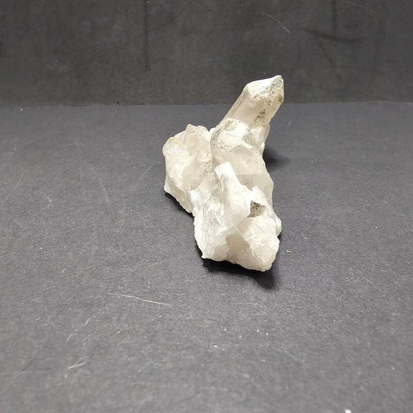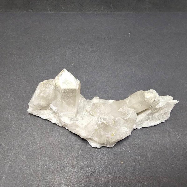 Ce qui caractérise cette pièce est sa forme allongée et horizontale, évoquant un "radeau" ou une ligne de crête cristalline. Les cristaux de quartz, d'une belle clarté translucide à laiteuse, sont disposés en grappe sur une matrice très fine et blanche, presque totalement recouverte par les bases des cristaux. L'agencement présente deux ou trois cristaux dominants à chaque extrémité et au centre, créant une composition équilibrée et scénique. Certains points de lumière ou de couleur jaune-ocre (inclusions ou minéraux secondaires) sont visibles sur les bases, attestant de son environnement de croissance minéralogique riche.