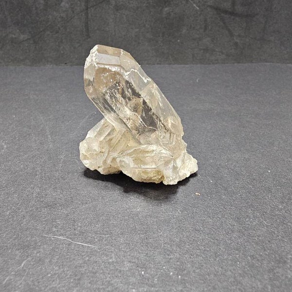 Ce spécimen est remarquable par la clarté et la couleur de son cristal principal. La teinte est un jaune-brun très pâle et chaud, pouvant être classé comme un Quartz Citrin naturel ou un Quartz Fumé très clair. Le cristal dominant est hautement transparent, permettant à la lumière de révéler ses faces prismatiques et sa terminaison bien marquée. Le cristal se dresse fièrement sur une base de quartz plus laiteux ou de roche hôte, lui donnant une posture élégante. La formation de ce type de cristal dans les fissures alpines témoigne des conditions géothermiques lentes et sous haute pression qui ont présidé à sa naissance.