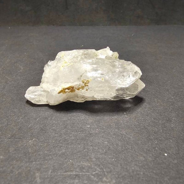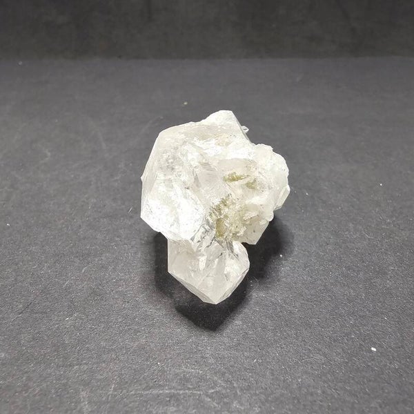 Cette pièce présente une formation mixte : une combinaison de cristaux massifs, aux faces larges et translucides, et d'une grappe de petits cristaux sur la matrice. L'aspect dominant est le grand cristal de Quartz qui montre une bonne clarté (Cristal de Roche). La roche mère (matrice) est clairement visible, d'une couleur allant du blanc crayeux au gris-vert, et elle est particulièrement intéressante car elle porte des traces de minéraux secondaires (inclusions) de couleur jaune-ocre ou verdâtre. Ces traces sont le signe d'une co-cristallisation avec d'autres minéraux alpins et ajoutent un élément de couleur et de contraste à l'ensemble.