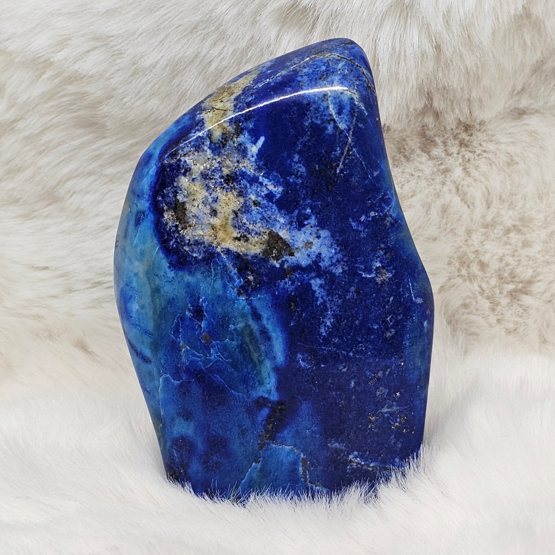 Couleur : Bleu, indigo, bleu outremer profond, souvent tacheté de blanc (Calcite) et de doré (Pyrite)