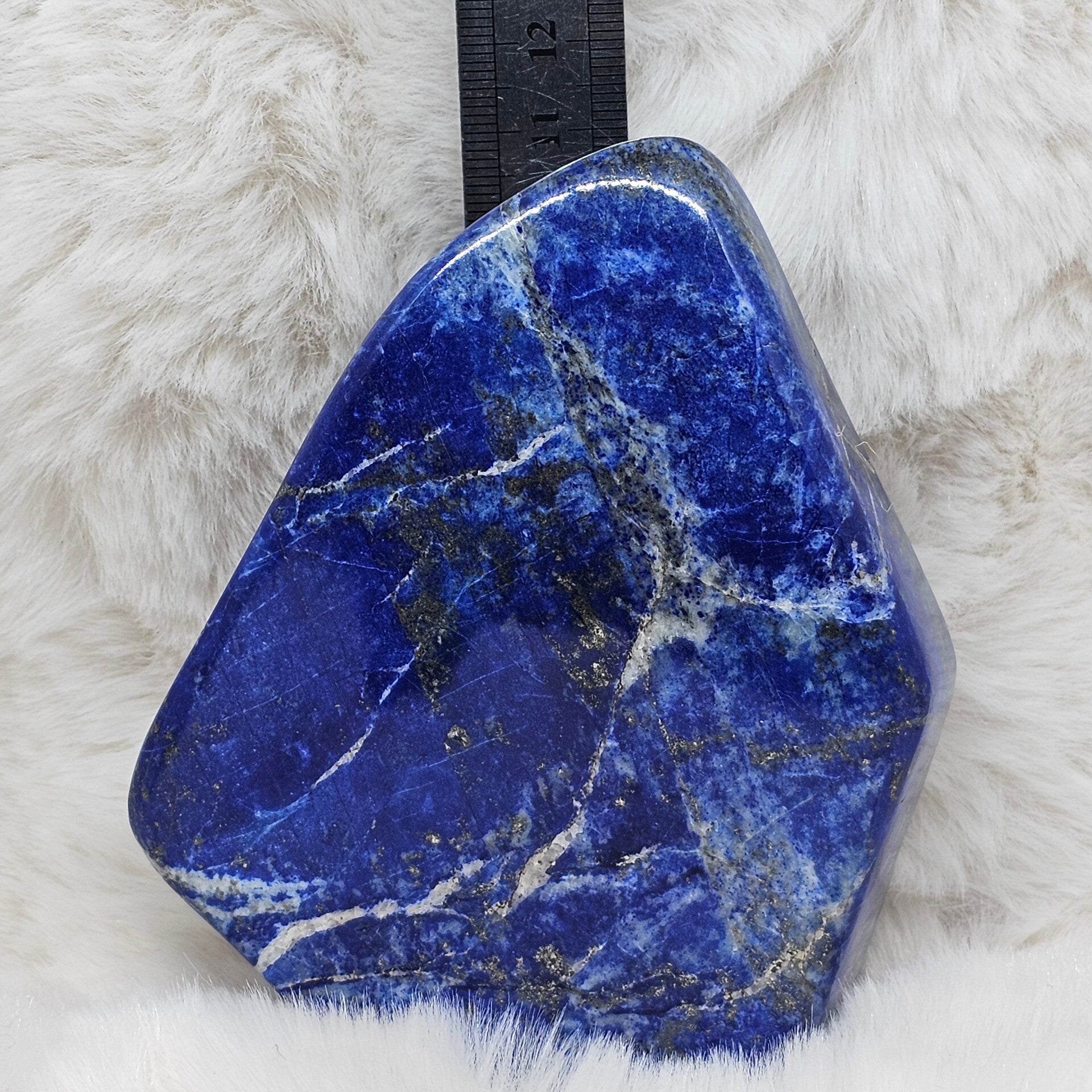 Couleur : Bleu, indigo, bleu outremer profond, souvent tacheté de blanc (Calcite) et de doré (Pyrite)
