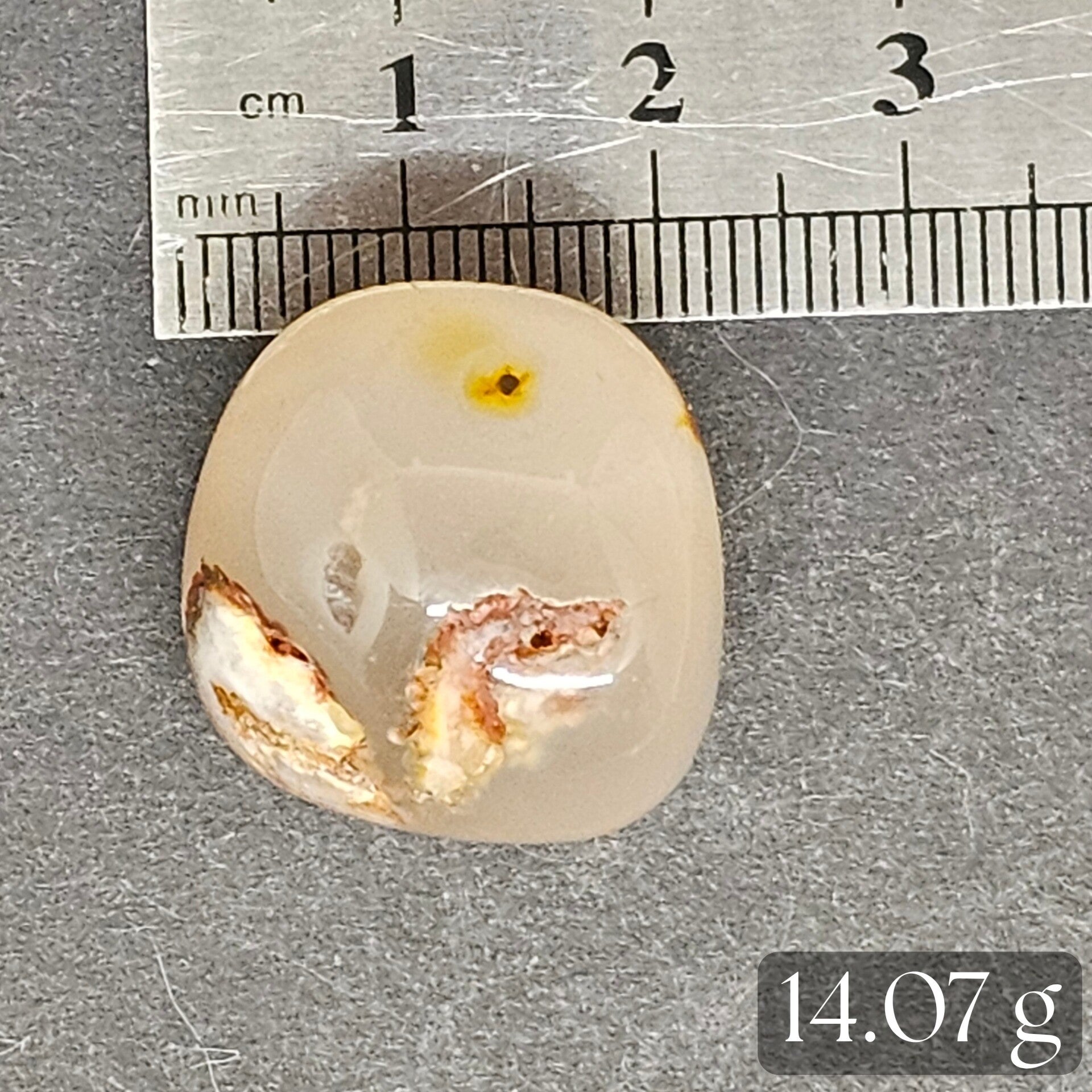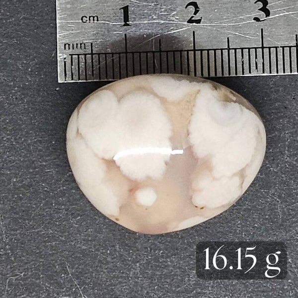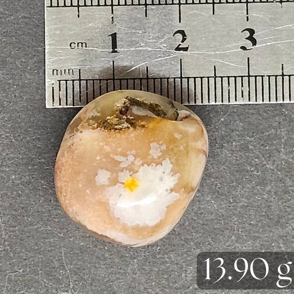 - Couleur : Rose pâle, beige, saumon avec des inclusions blanches opaques (fleurs de calcédoine)