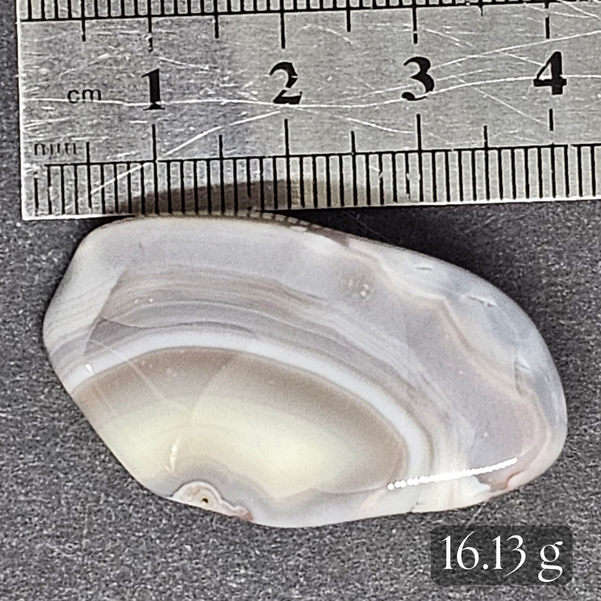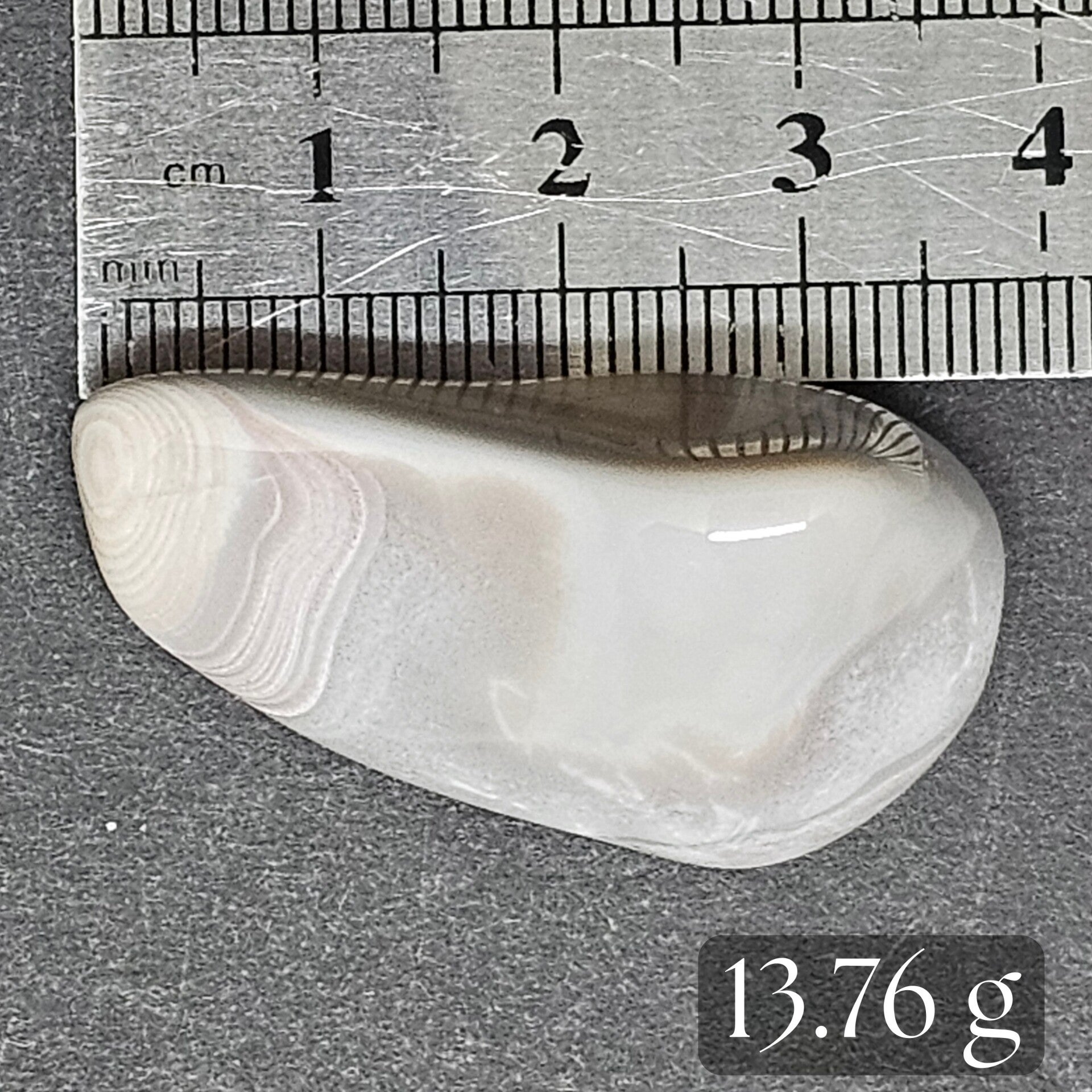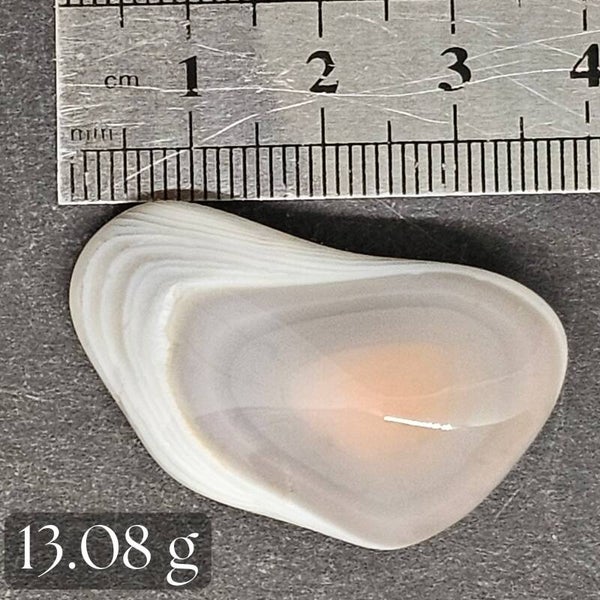 Spécimen présenté : Agate grise avec des rubans concentriques blancs et un cœur orange translucide, polie en forme libre. Poids : 13,08 g. Dimensions : environ 3,6 cm x 2 cm.