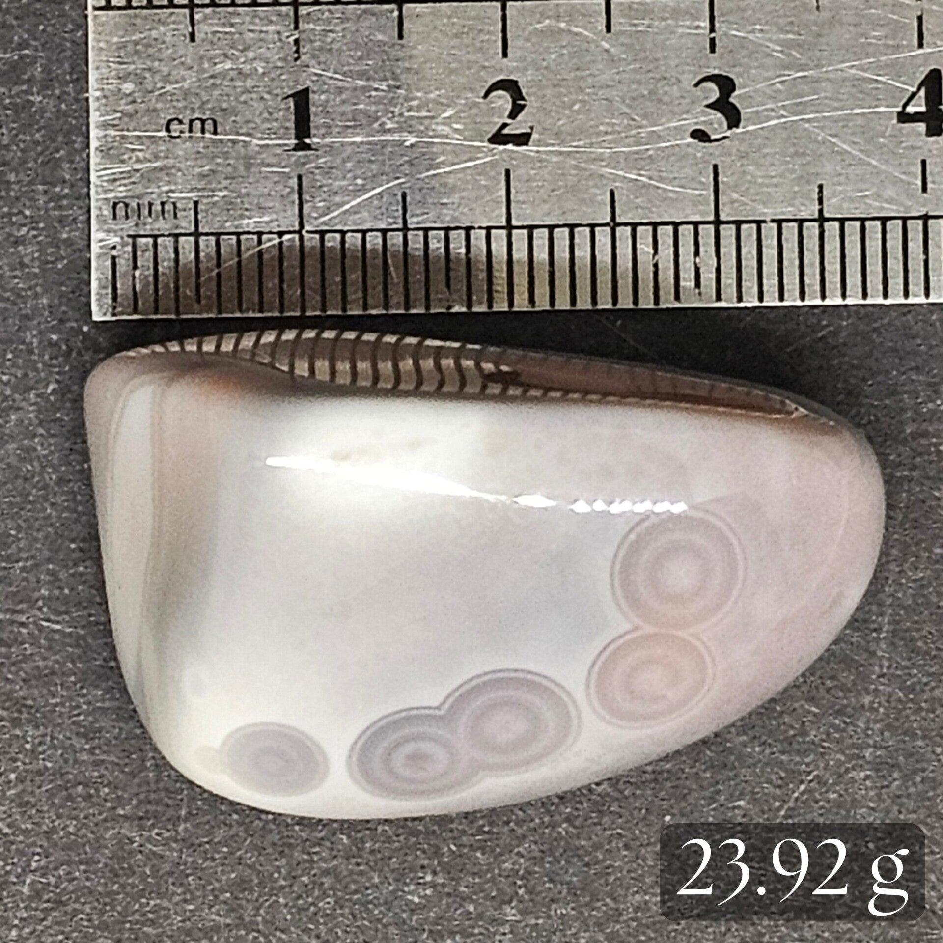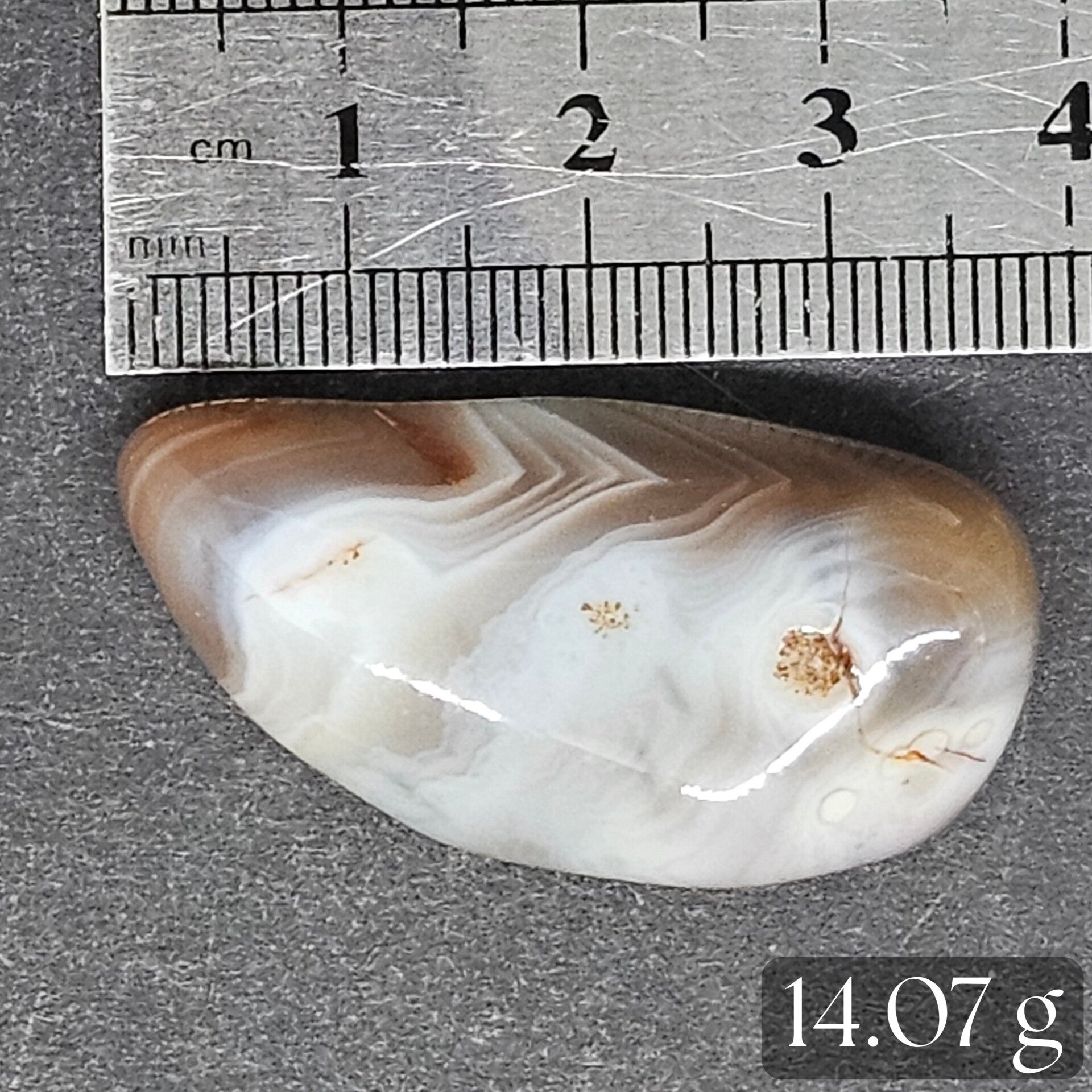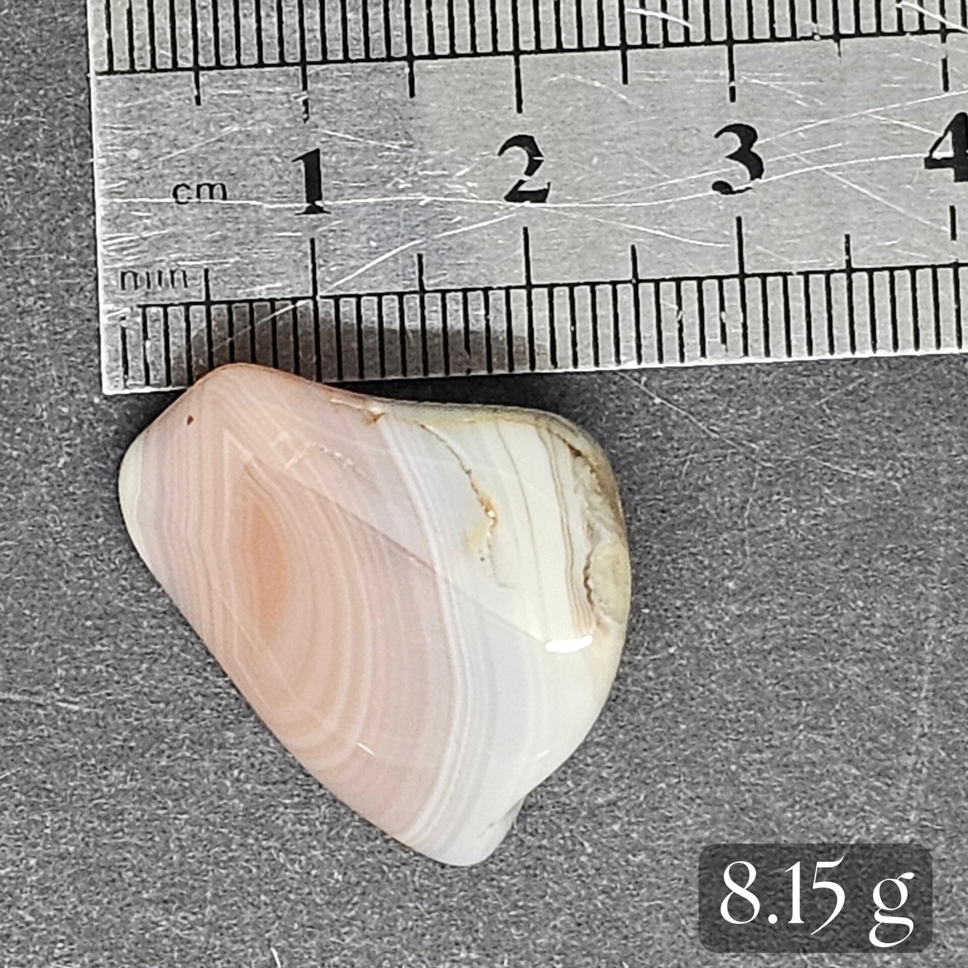 Spécimen présenté : Agate grise avec des rubans concentriques blancs et un cœur orange translucide, polie en forme libre. Poids : 13,08 g. Dimensions : environ 3,6 cm x 2 cm.