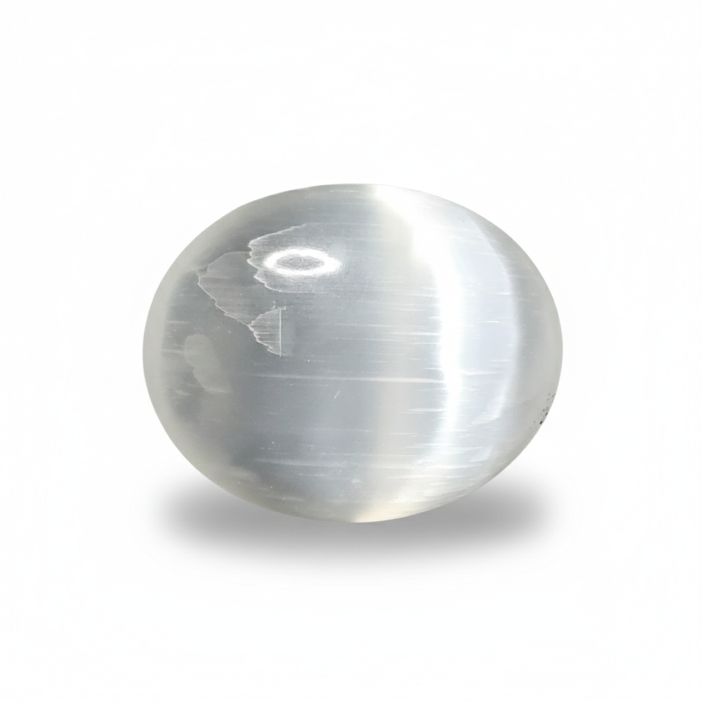 Le Satin Spar (Le plus courant) : C’est la version blanche, fibreuse et opaque qui possède un éclat soyeux. Elle crée cet effet "œil de chat" (chatoyance) quand on la bouge à la lumière. C'est elle que l'on trouve partout sous le nom de Sélénite.